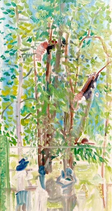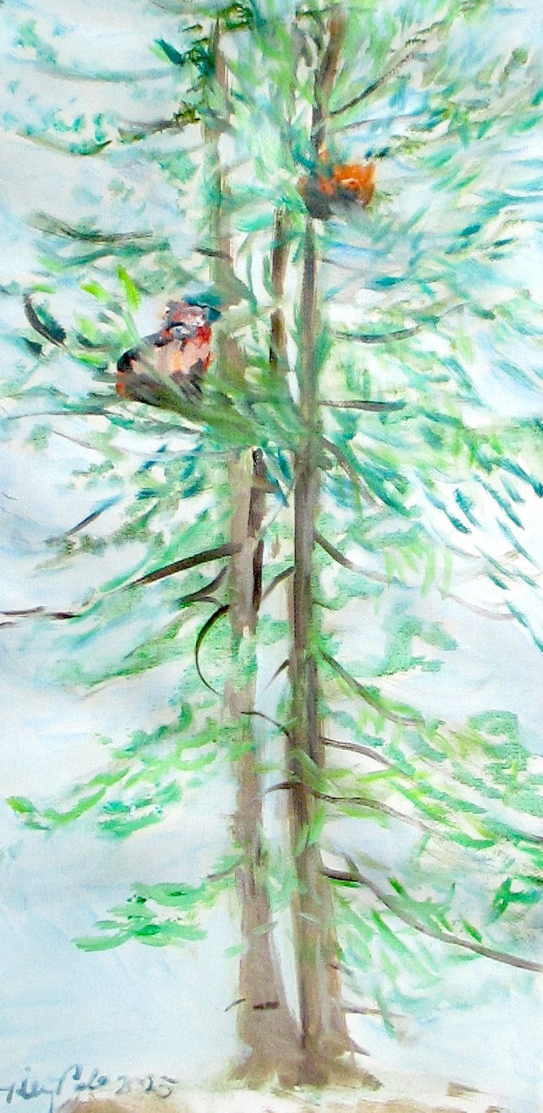 This painting shows their camouflage better than the first painting. It shows how people loved to watch the pandas and how the younger panda(on the right) was in constant motion, a blur of orange and black going up the tree. She seemed really to have fun climbing up and down the trees and even swinging on a lower branch to let herself down to the ground.