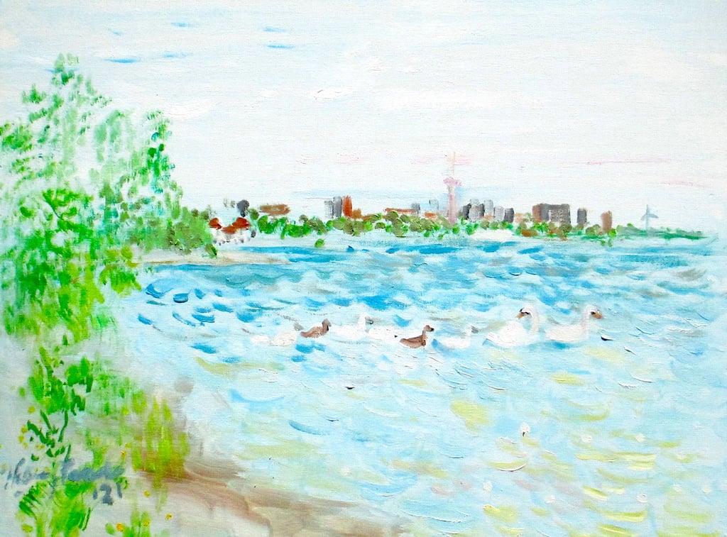 The reality is that mute swan eggs are oiled by the authorities so that there is usually no outcome. Mute swans are considered invasive across north America. With strict population control, it is rare for even one cygnet to hatch. What a surprise it was to find a family of nine at the lake for once in my career. It was exciting to paint them from the beach.