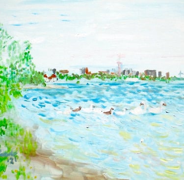 Happy Canada Day weekend! These paintings are a celebration of what we have in Canada. As the Duke of Edinburgh affirmed on Canada Day 2025, we are celebrating! Welcome to the new website. You will find work from various series here. Mainly, there are birds. There are also other animals and people sitting or moving through the scene. Scenery varies from winter to summer. Typically, I paint outdoors. Like a photographer, I need to be at the place in the picture. Once I was painting the cherry blossoms in High Park and a photographer asked me, "Where are all the garbage cans?" and then she realized, "Oh, you didn't put them in because you are painting."